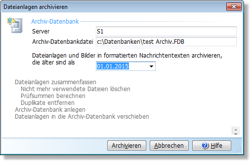 Die Funktion Dateianlagen archivieren bietet Ihnen die Möglichkeit, Ihre Produktivdatenbank schlank zu halten und so z.B. die tägliche Datensicherung zu beschleunigen und den dafür benötigten Speicherplatz zu reduzieren.