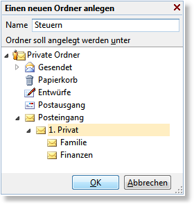 Um die Speicherung von E-Mails übersichtlicher zu gestalten, empfehlen wir Ihnen, in den Ordnern Gesendet und Posteingang Unterordner anzulegen. Mit Hilfe der Ordner können Sie dann Ihre E-Mails nach Ihren Wünschen organisieren. Die Ordner werden als Baumstruktur dargestellt. Jeder Ordner kann beliebig viele Unterordner besitzen.